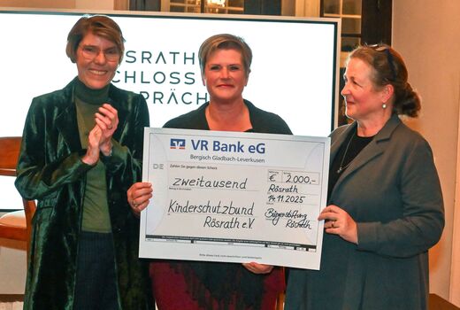 Über den Erlös des Abends in Höhe von 2.000 Euro freut sich der Kinderschutzbund Rösrath e.V.. Den Scheck überreichte Norbert Lenke, Vorsitzender der Bürgerstiftung Rösrath, an die beiden geschäftsführenden Vorstandsmitglieder des Rösrather Kinderschutzbundes, Petra Berndorff und Heike Schmitz. Diese gaben an, den Betrag für die Realisierung eines Medienprojektes für Rösrather Kinder einsetzen zu wollen.